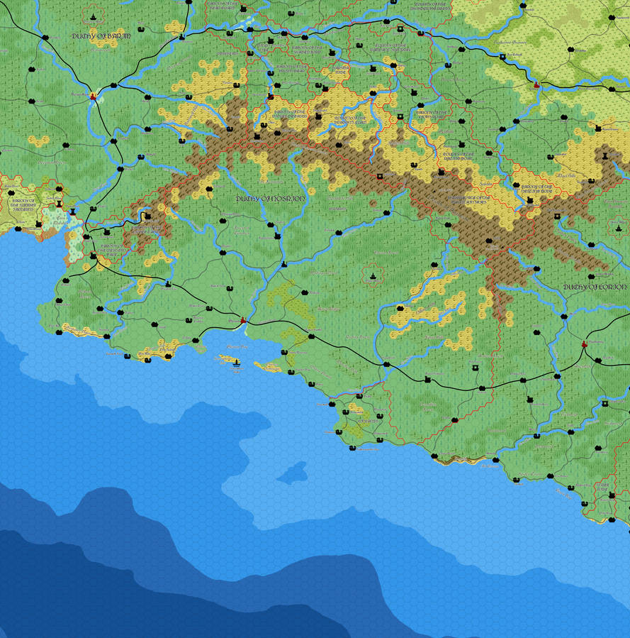 This is the Duchy of Nosrion, and surrounding lands in 500BC. The peak of the new Thonian Empire and just when the Alphatians begin their colonisation of the Esterhold peninsular to the south.